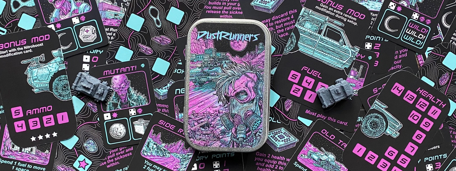 (8) But wait, there's more! As a small bonus, I have added 2 new dustrunner minis to the game that you can use to track your postion on the map cards and the position of the pesky raiders!
