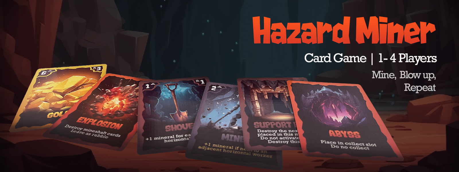 Each turn, you will draw a card and take a set of two actions: Place a card in a mineshaft or collect gold from a mineshaft. You must balance the risk of hazard cards with the reward of mining for more gold. The game ends either when the mineshafts are entirely full of cards, or you and your friends have collected 6 times. You will then rank the amount of gold you have collected against the other players to see where you rank on your quest to become the hazard miner.