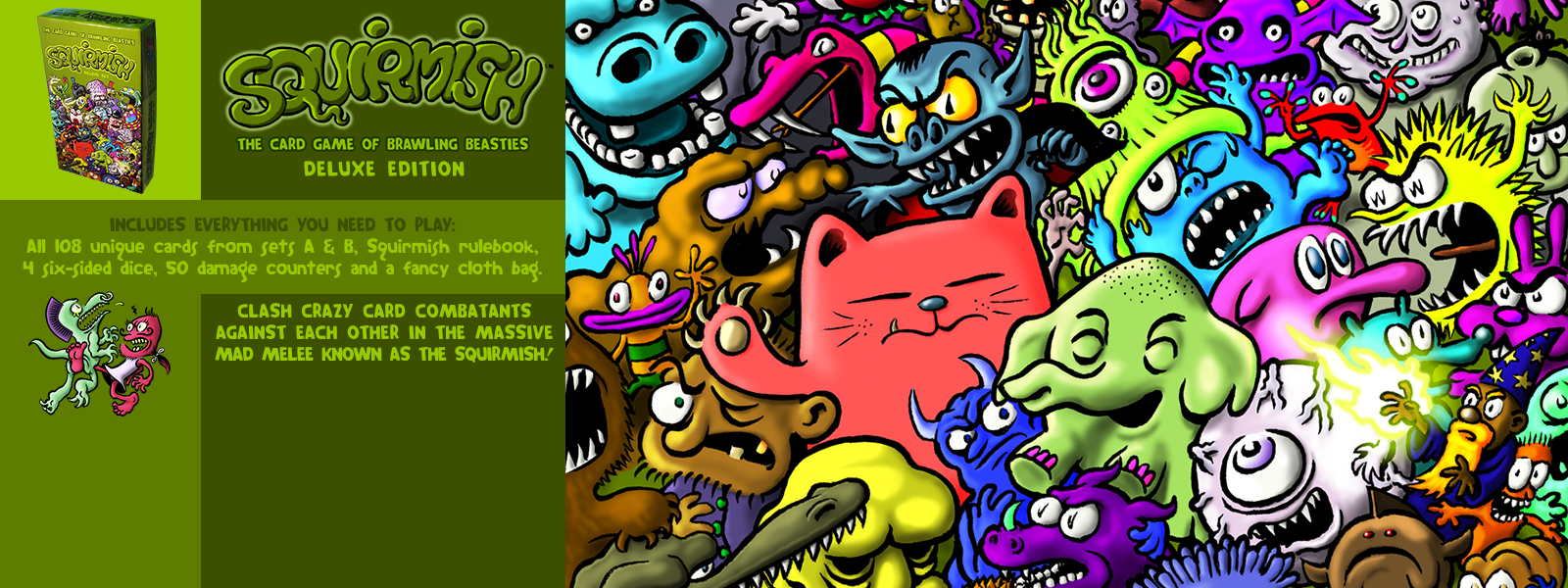 The Squirmish Deluxe Set includes all 108 cards from Starter Sets A and B, as well as the rulebook, 4 6-sided dice, and a fancy cloth bag with 50 fancy damage counters for fancier fighting.