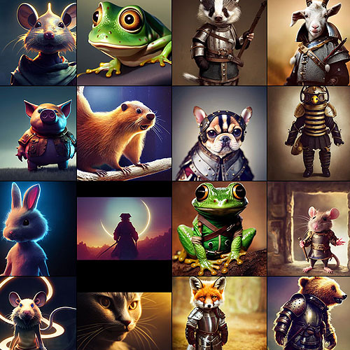 This package contains over 300 images, focused on animals and anthorpomorphic animals in a fantasy / RPG genre. A variety of animals are represented, with many dressed in fantasy wardrobe and armor.