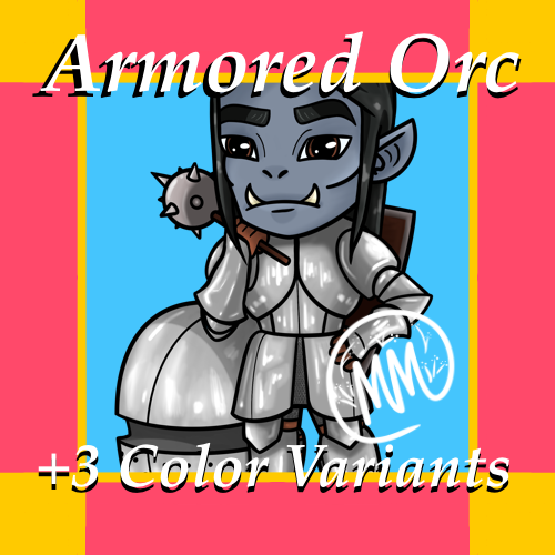 This character pack includes 4 different color schemes for this armored orc. It comes with 8 files as each color scheme comes with a background and a transparent background so you can choose how best to utilize them.