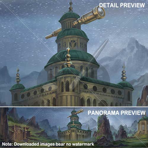 This large scale panorama artwork spans about 3500 by 1500 pixels. It features a fantastic landscape picturing a Wizards Tower, an Ancient Temple as well as a mysterious Dungeon Entrance. Each panorama pictures one of the typical geographical regions found in most high-fantasy settings.