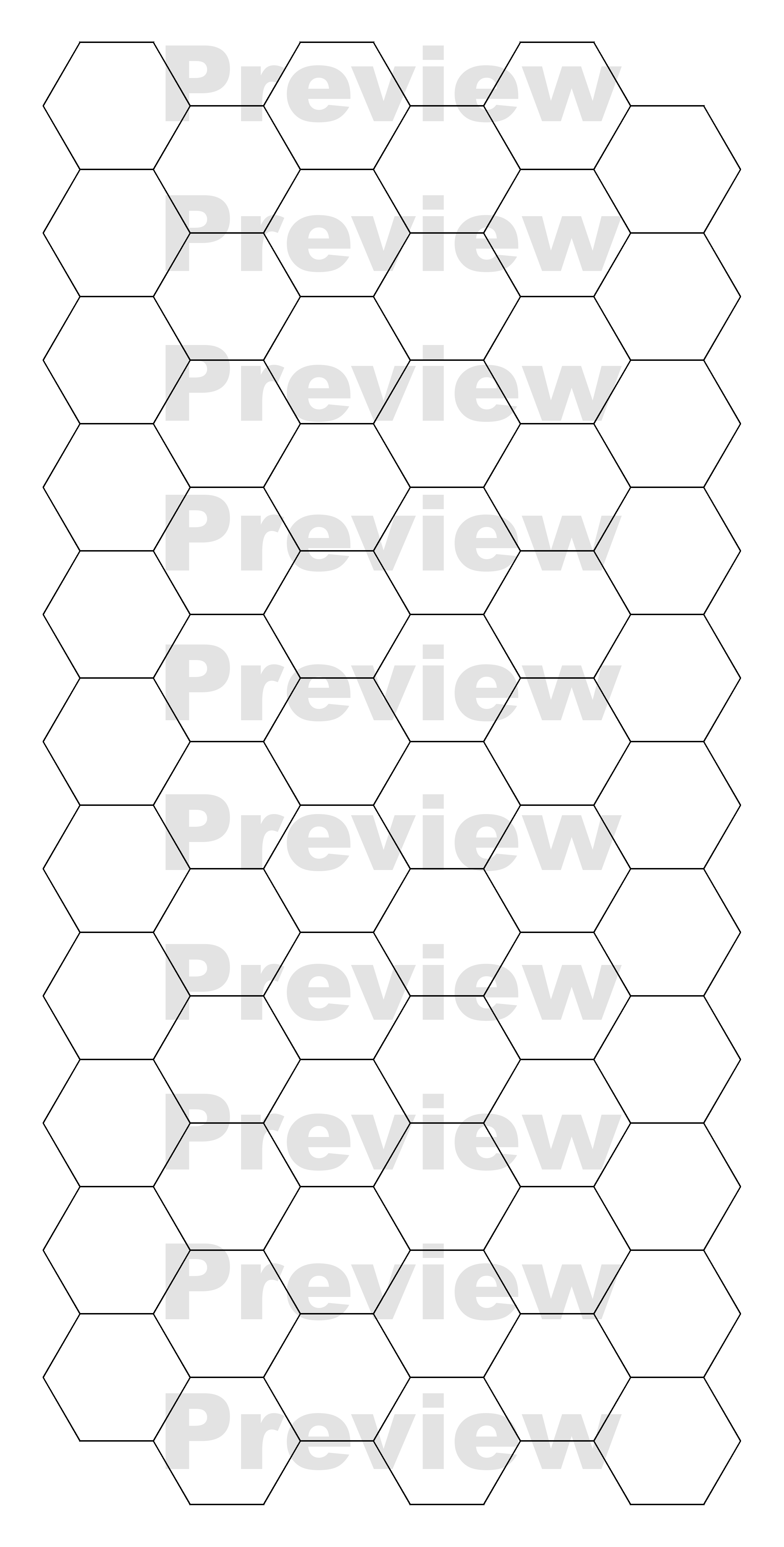 A template for Bi-Fold Game Board (9" x 18") with six by eleven 1.5” (38mm) hexes.