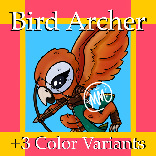 This pack comes with four unique colorschemes for this awesome bird archer. There are eight files in total as each color scheme comes with a colored background along with a transparent background. Perfect for any fantasy themed games or game makers who like vibrant characters. Hand-drawn digital art, NO AI used in the creation of this character. All files are png.