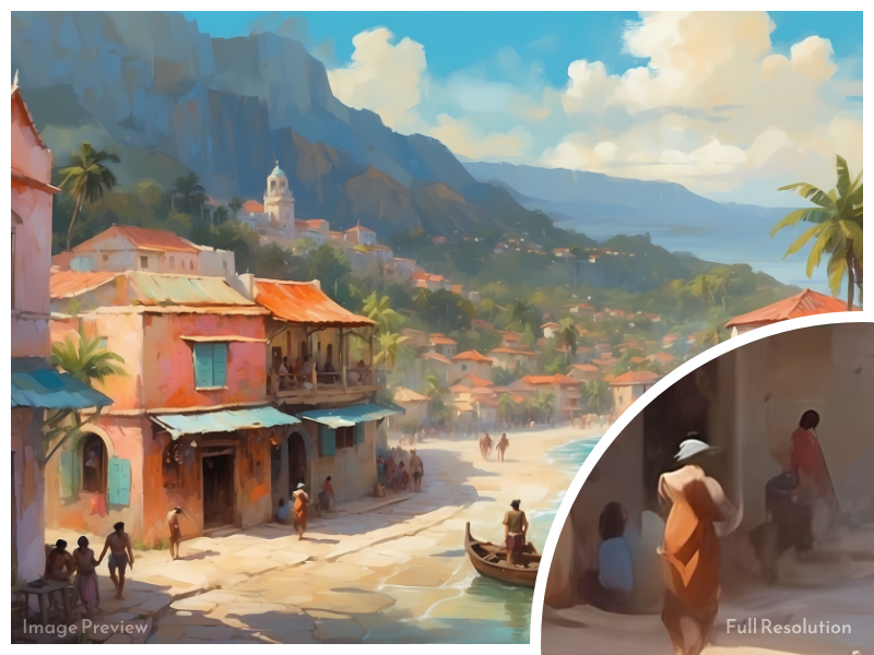 A beautiful digital painting of an old caribbean-inspired harbour town, with people milling about and a dinghy sitting in the water.