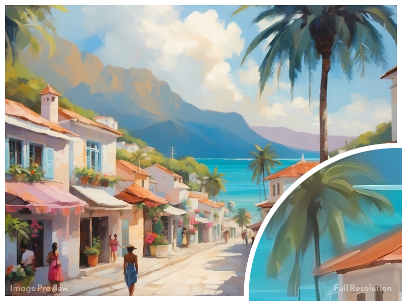 A beautiful digital painting of a calm, sunny caribbean-inspired street in a coastal town, overlooking the ocean.