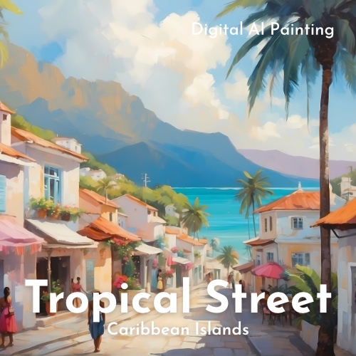 A beautiful digital painting of a calm and sunny caribbean-inspired street