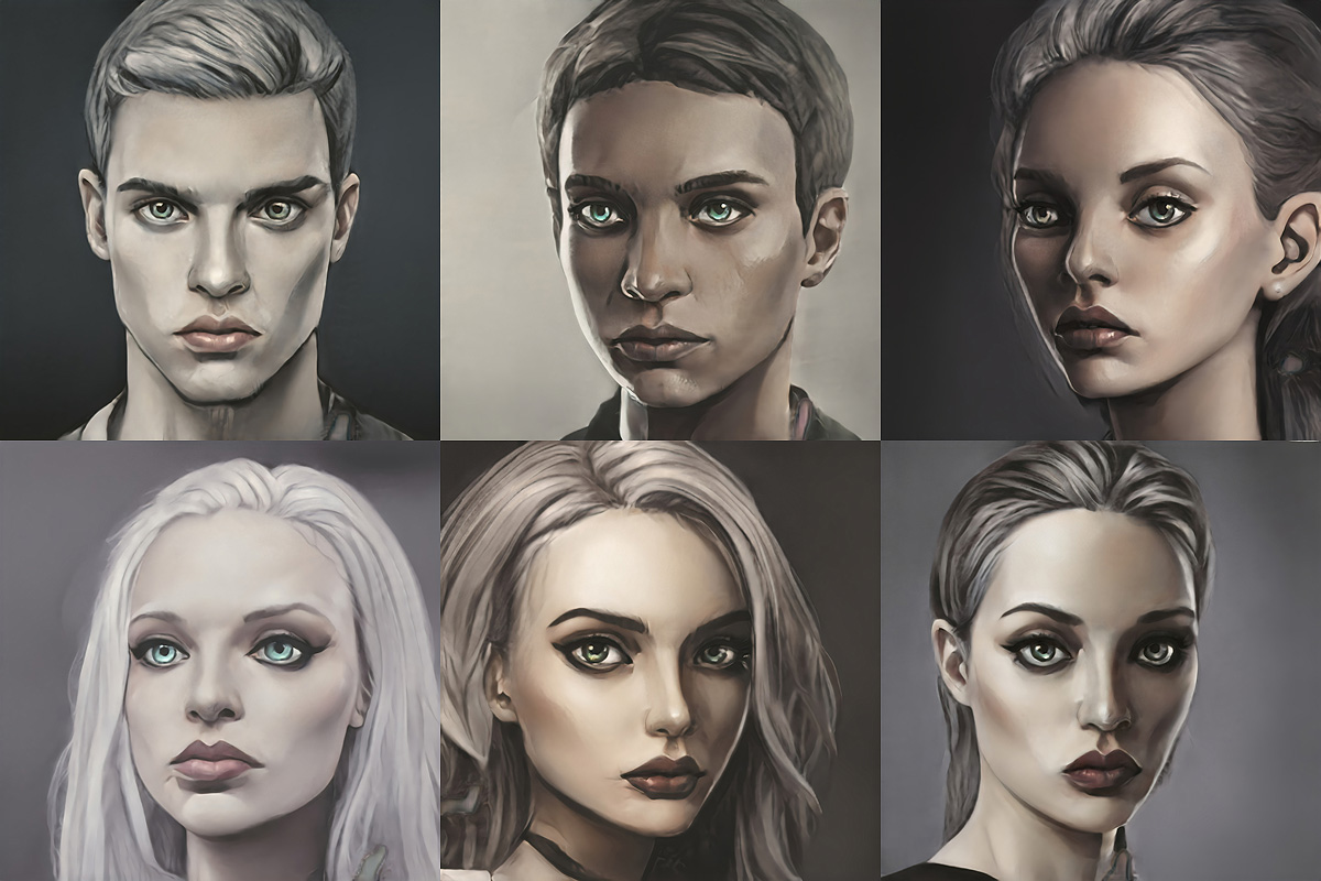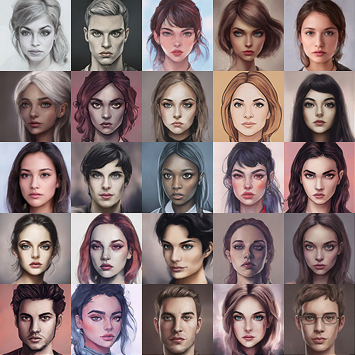 This package contains over 1500 character portraits created using AI, in multiple styles. They are created by combining AI portraits (i.e. not of real people) together, while also modifying the art style, turning a photo realistic portrait into a sketch, something painted, or even drawn like a cartoon.
