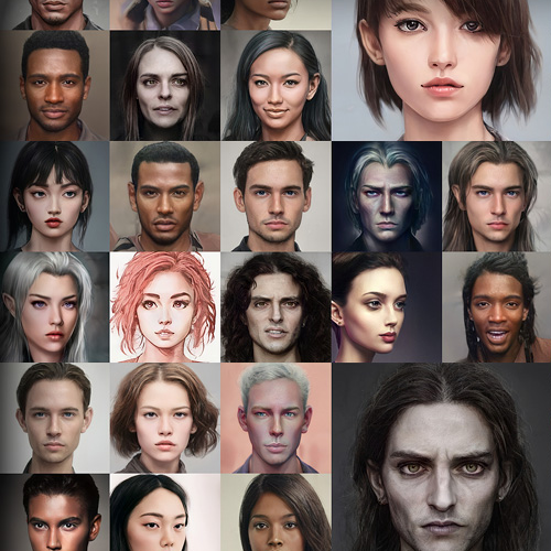 This package contains over 1300 character portraits created using AI, in multiple styles.
