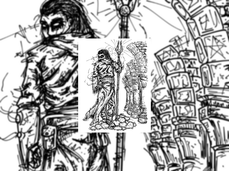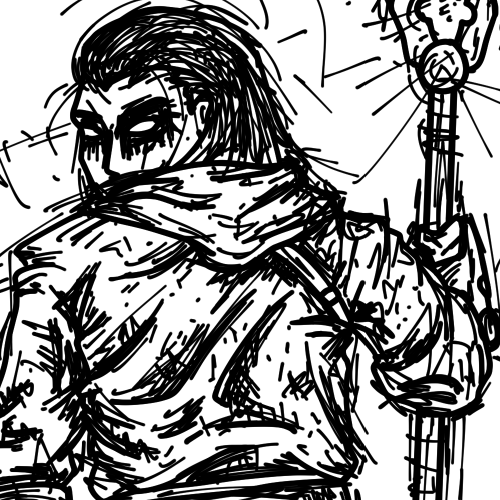 This is a character sketch of a battle wizard walking through a tomb or catacomb keeping an eye out behind him for trouble.