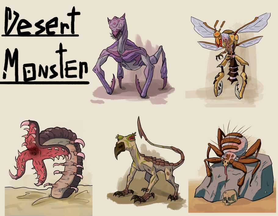 This is a collection of 5 2d monster illustrations in a desert setting. This will be a interesting start or add on for a fantasy game. Let your hero face the foes!