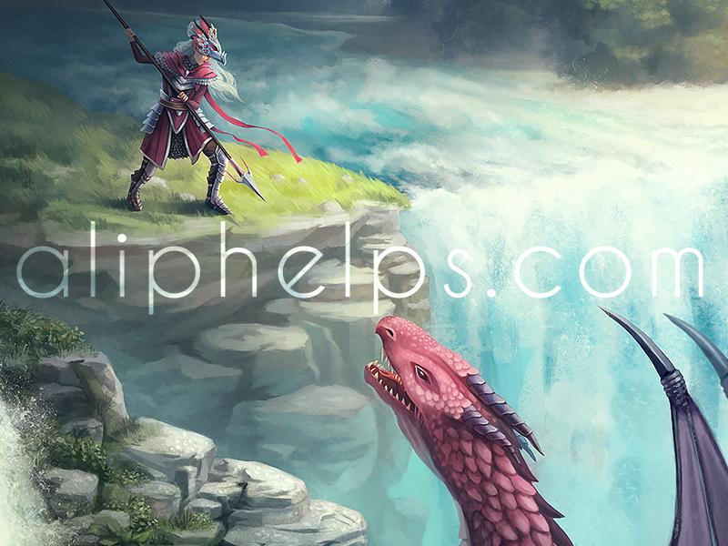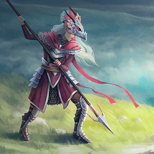 An illustration of a fantasy lancer facing off against a dragon.