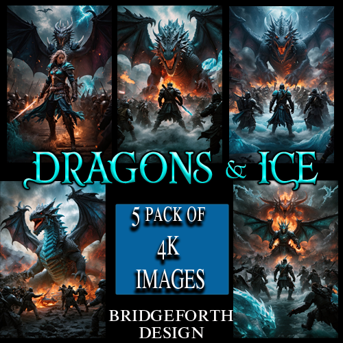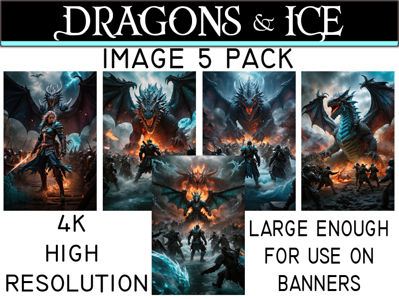 Digital Action Shot Images with Dragons, Warriors, some fire, and lots of blue ambiance. Large scale 4K image pack, large enough to print for banners and packaging. Make your game design stand out with these exciting images.