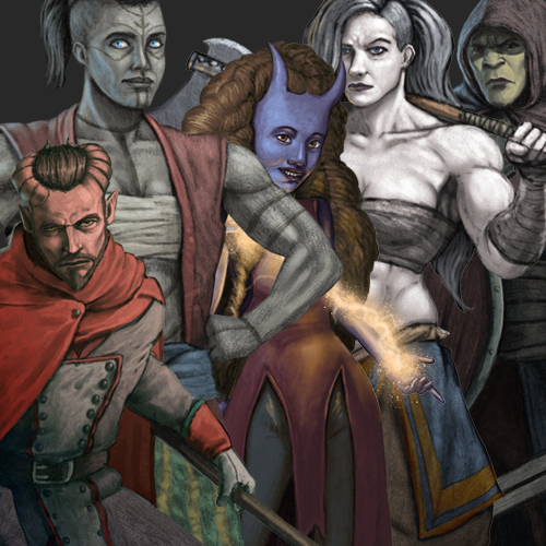 Five high quality, hand drawn (3000 x 3000 pixels) images of fantasy characters. Each character illustration comes in three file formats: jpg (with background), png and tiff (with transparent backgrounds).