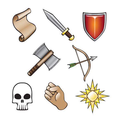 Scroll, Sword, Shield, Ax, Bow and Arrow, Skull, Fist, and a Sunburst shape. Possible class icons for Wizard, Warrior, Paladin, Barbarian, Ranger, Necromancer, Monk, and Cleric.
