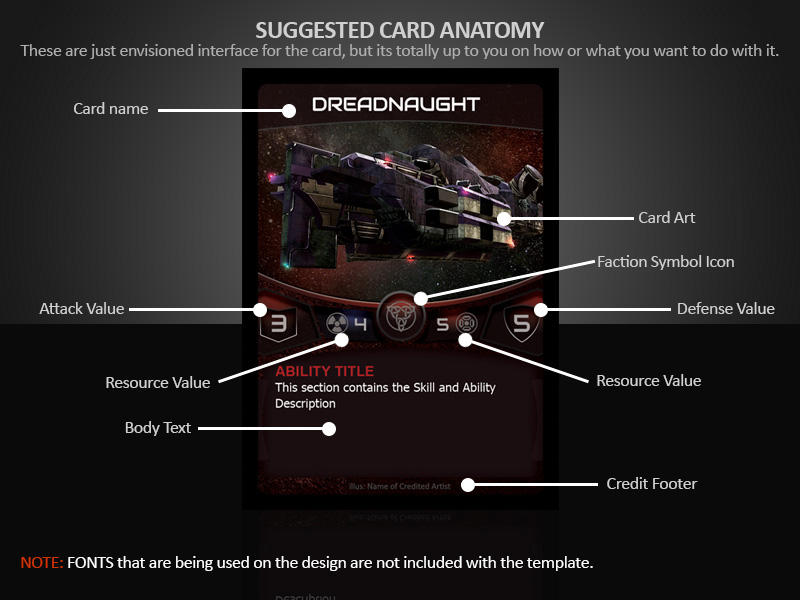 Galactic Warfare 2 Card game template was designed specifically with epic space battles in mind. The package contains 4 PSD files (3 faction color scheme cards and 1 ability card) formatted on CMYK and on a high resolution 300dpi scale. Organized Layered layouts makes it easy for customization and design control.