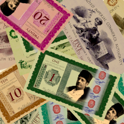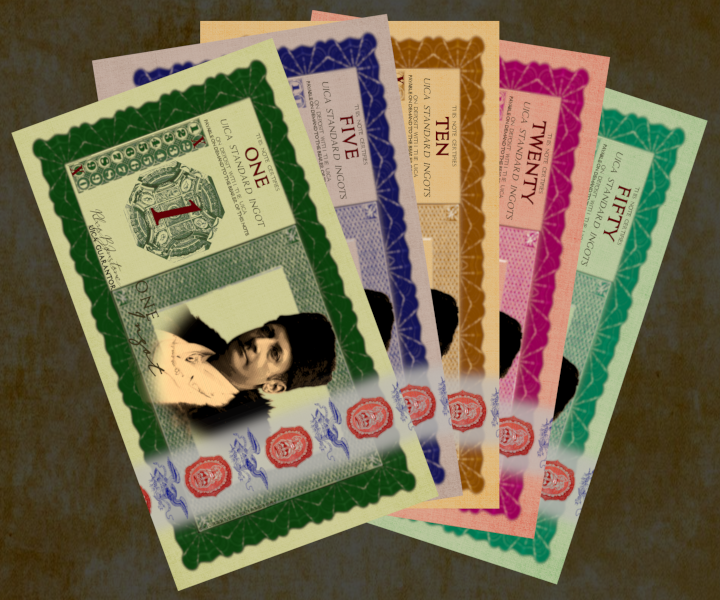 Currency representing an unspecified "ingot" on deposit as was represented on backed currencies such as U.S. Silver Certificates. These "Depository Certificates" have been designed with elements from both modern currencies as well as those of the past so they'll seem right at home in games set in any era.