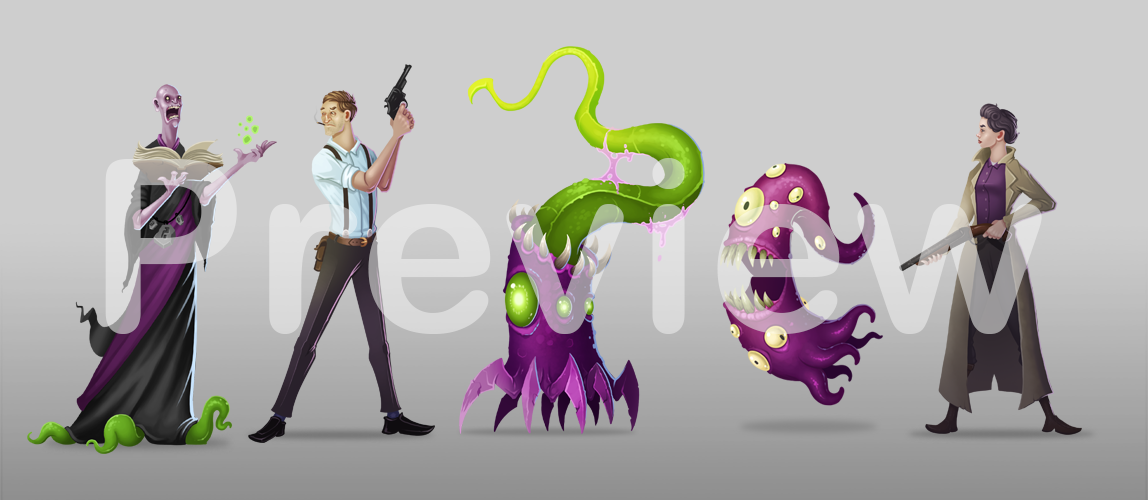 This is a collection of 5 2d character illustrations in a "paranormal" setting. The set includes 2 monsters, two human characters, and one corrupt priest. These illustrations are the perfect starting point for a board/card game. Hope you enjoy!