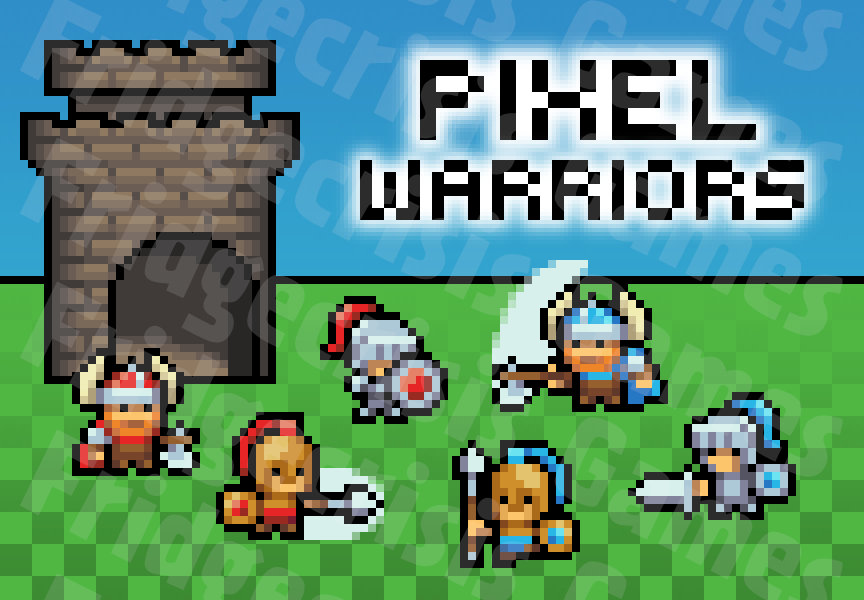 A set of 3 finely-crafted pixel warriors in 2 different team colors and 7 different poses for a grand total of 42 sprites. Also includes a castle for them to defend! Ideal for tokens, standees, or cards in a simple 2-player battle game.