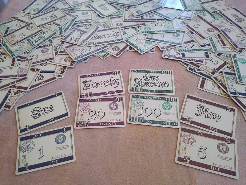 Card-based play money usable with any game that uses play money.