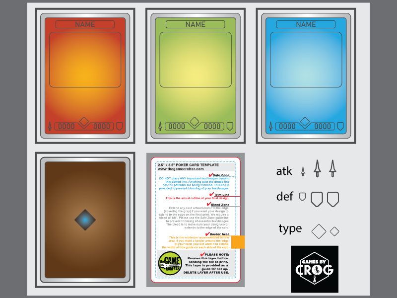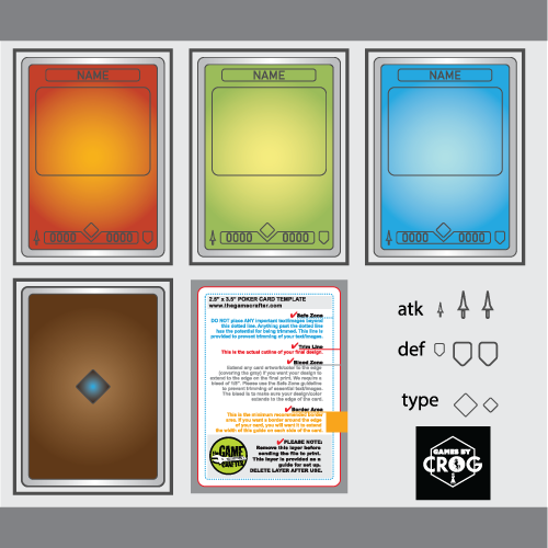 3 Simple color Poker Card TCG design Templates with back design and assets icons. All customizable
