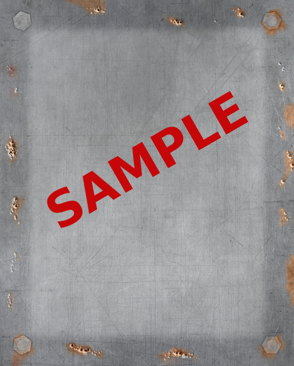 A page background featuring a piece of beaten and rusted metal bolted in place.