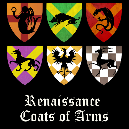 The Renaissance Coats of Arms includes 11 different, authentic emblems: gryphon, dragon, mermaid (2x), eagle (2x), warthog, wolf, leopard, deer and lion. These are based on emblems depicted in a Renaissance era primary source.