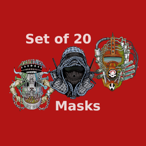 Set of 20 Masks Color Anti cage Anti darkness Anti death-blow Anti doppelganger Anti freeze Anti gravity Anti lies Anti microwave Anti mind control Anti ork Anti poison gas Anti quemical Anti scare Anti terrorist time bomb Anti time Elements to mind Flatworm coach Roach coach Telescopic Triple socket warrior mask