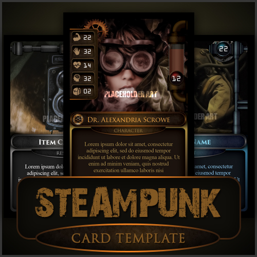 Steampunk card template is a set of 5 PSD files designed with a dystopian future in mind. These are highly detailed templates on a 300 DPI scale on CMYK format rendered specially for printing. Dimensions: standard Poker Size (2.5 x 3.5 inches) The set contains the following: