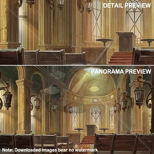 This scenic fantasy artwork spans around 3000 by 1500 pixels and features a magnificent indoor location. Pictured is a typical environment, and several pieces of interiorĀ as found in most medieval or high-fantasy towns.