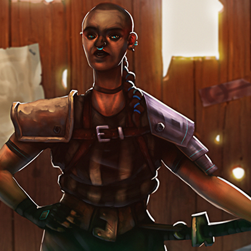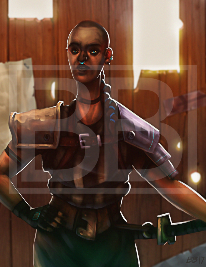 Post-Apocalyptic fighter/scavenger posing with her weapons.