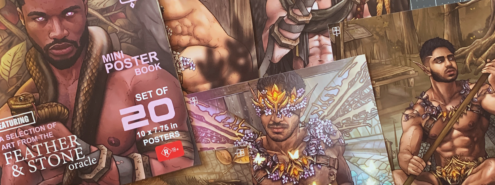 [MINI POSTER BOOK]: Feather & Stone contains 20 single-sided gay fantasy art posters from the Feather & Stone Oracle.