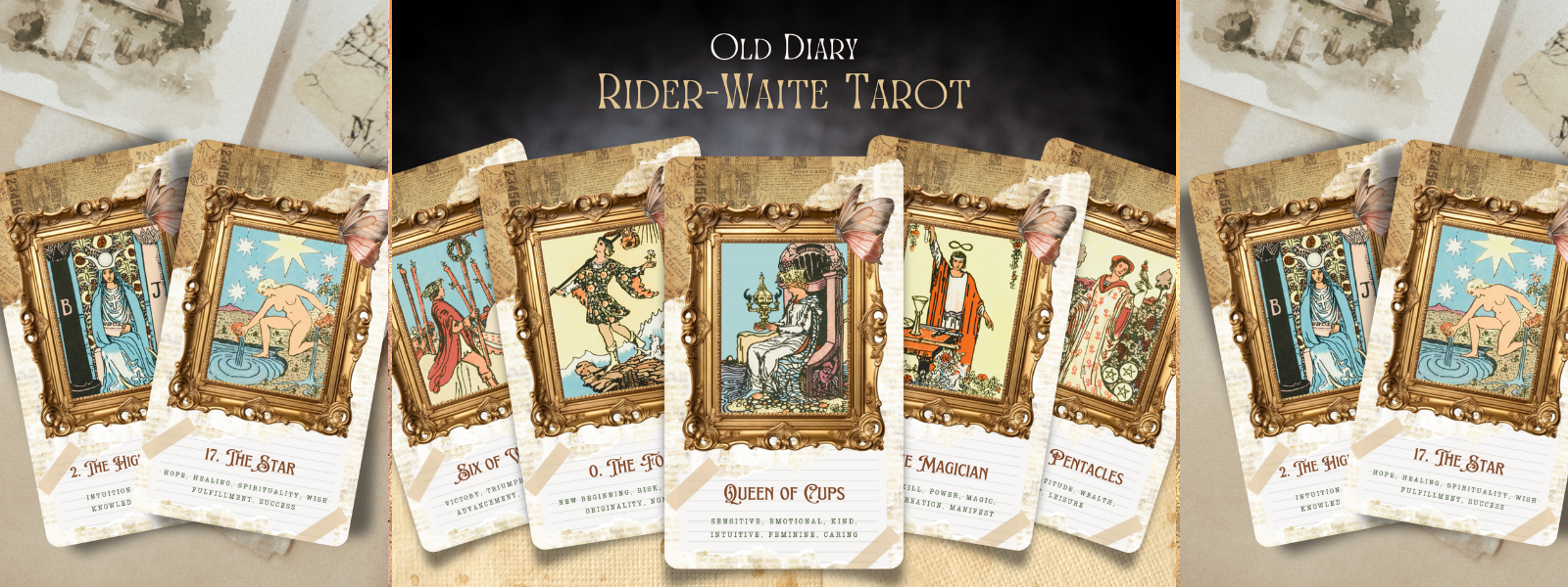 Traditional Rider Waite tarot deck designed in a retro-vintage style. The meanings are listed on the cards, making them ideal for beginners.