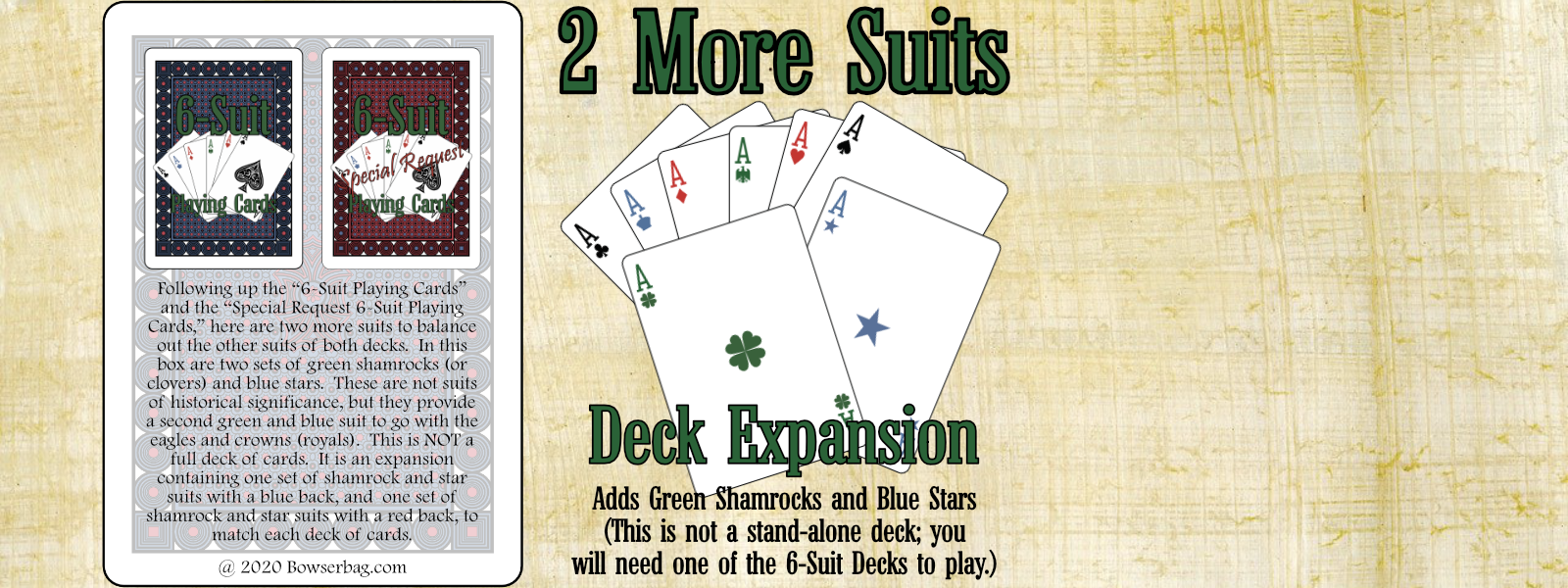 Following up the “6-Suit Playing Cards” and the “Special Request 6-Suit Playing Cards,” here are two more suits to balance out the other suits of both decks. In this box are two sets of green shamrocks (or clovers) and blue stars. These are not suits of historical significance, but they provide a second green and blue suit to go with the eagles and crowns (royals) in the other decks. This is NOT a full deck of cards. It is an expansion containing one set of shamrock and star suits with a blue back, and one set of shamrock and star suits with a red back, to match each of the other two card decks.
