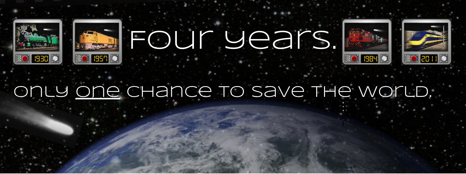 Four brave scientists will simultaneously time travel between the last four years of periapsis ‒ 1930, 1957, 1984, and 2011, to attempt to destroy the deadly comet. They must ensure the explosive cargo reaches the Rocket Station in time. The only consistent form of travel across these years is rail, so they must build an iron path for the cargo to reach its destination.