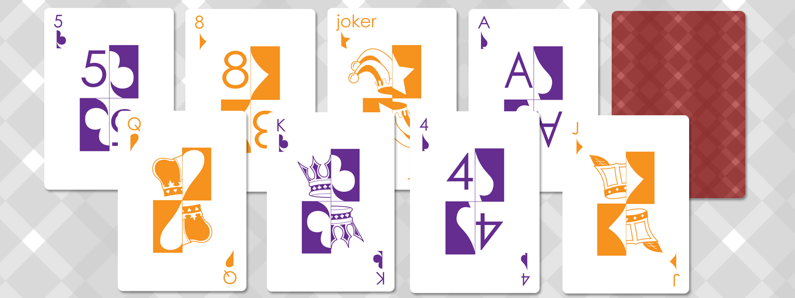 Standard 52-card poker deck with two jokers, featuring a sleek minimalist design. This variation on the deck includes a red card back with purple and yellow suits.