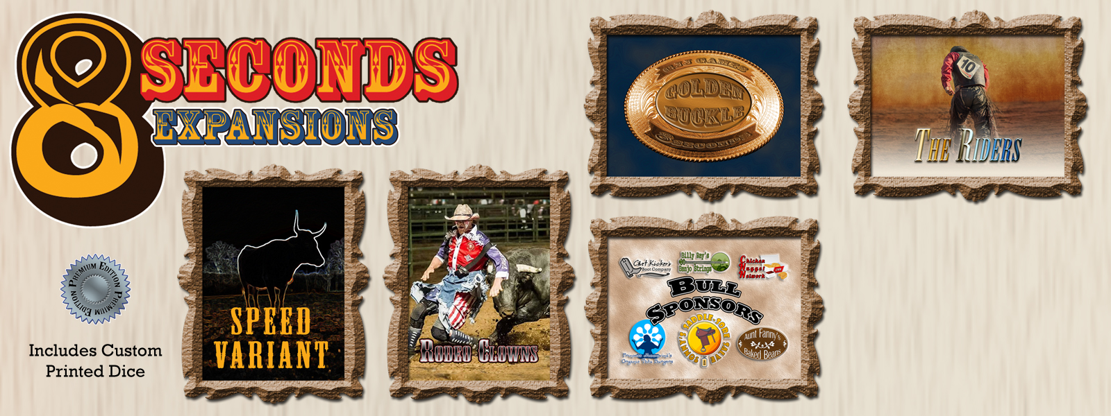 8 Seconds is a press-your-luck dice and card game for 1-6 players about the action and excitement of bull riding in a rodeo. These Expansion Modules can be used to change up the game and add more gameplay options. Included are four modules that can be used with the base game in any combination and one completely new way to play 8 Seconds: