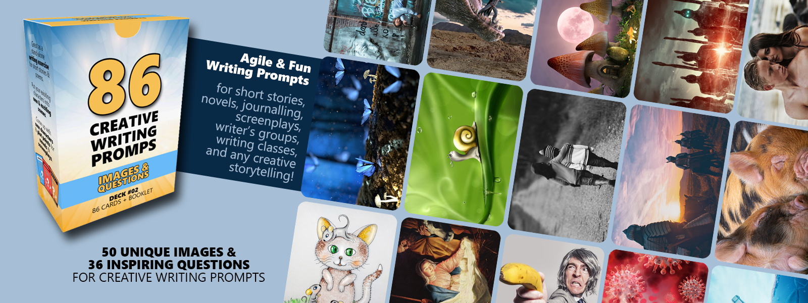 86 Images & Questions Writing Prompts is an agile creative writing tool. The box contains a booklet and 86 individual cards; 50 unique images of all genres, and 36 inspiring questions.