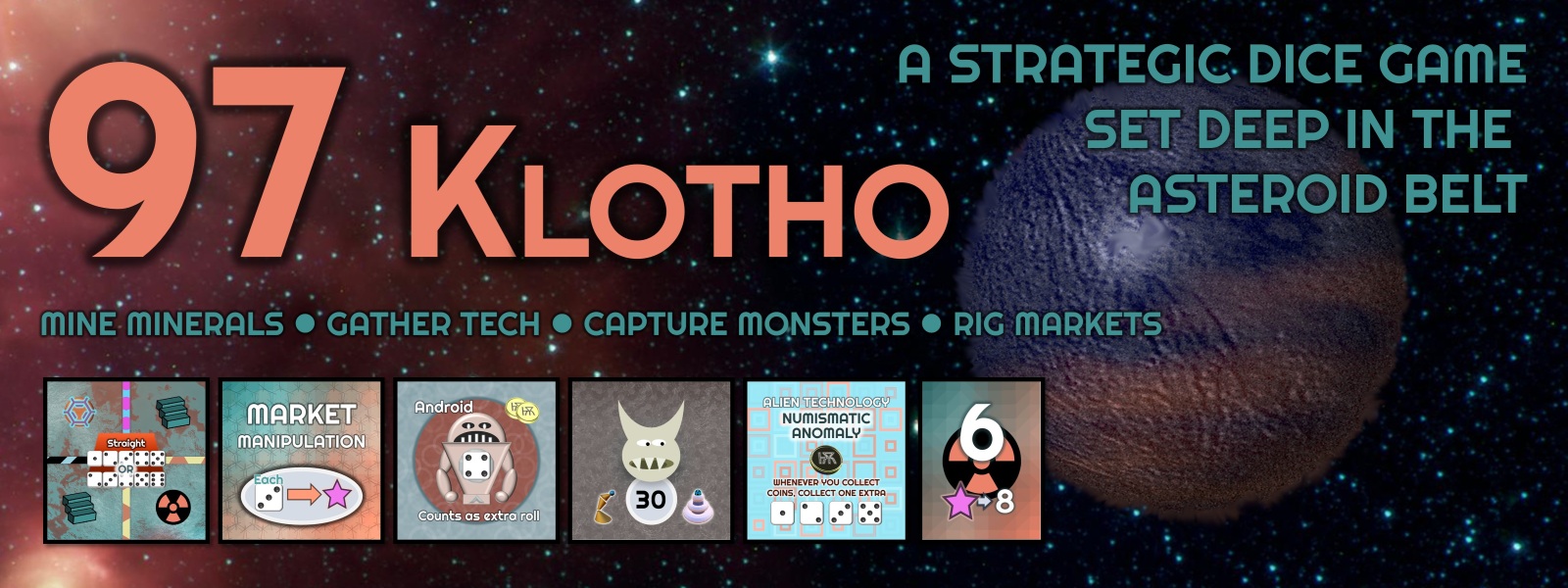 97 Klotho is a strategic dice game where you battle with other players to exploit a mysterious asteroid outside the orbit of Mars. The dice you roll can be used for many different goals - mining for minerals, capturing alien monsters, discovering ancient artifacts, amassing wealth to buy technology upgrades, manipulating markets, and more.