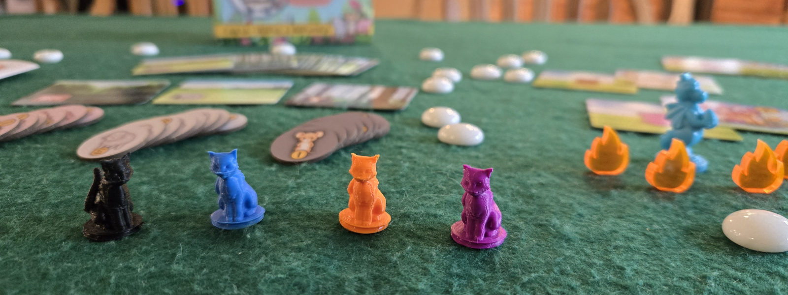 I went out of my way to choose components that are just fun to handle and play with. Having some experience gaming with kiddos, I knew the components are half of the appeal. So we've got a nice, sturdy box, some cool animal tokens, some heavy, marble-style gems (but not perfectly round so they don't roll away), plastic cat and dragon minis, and some cool semi-transparent fire markers. All fun to handle and nice to look at.