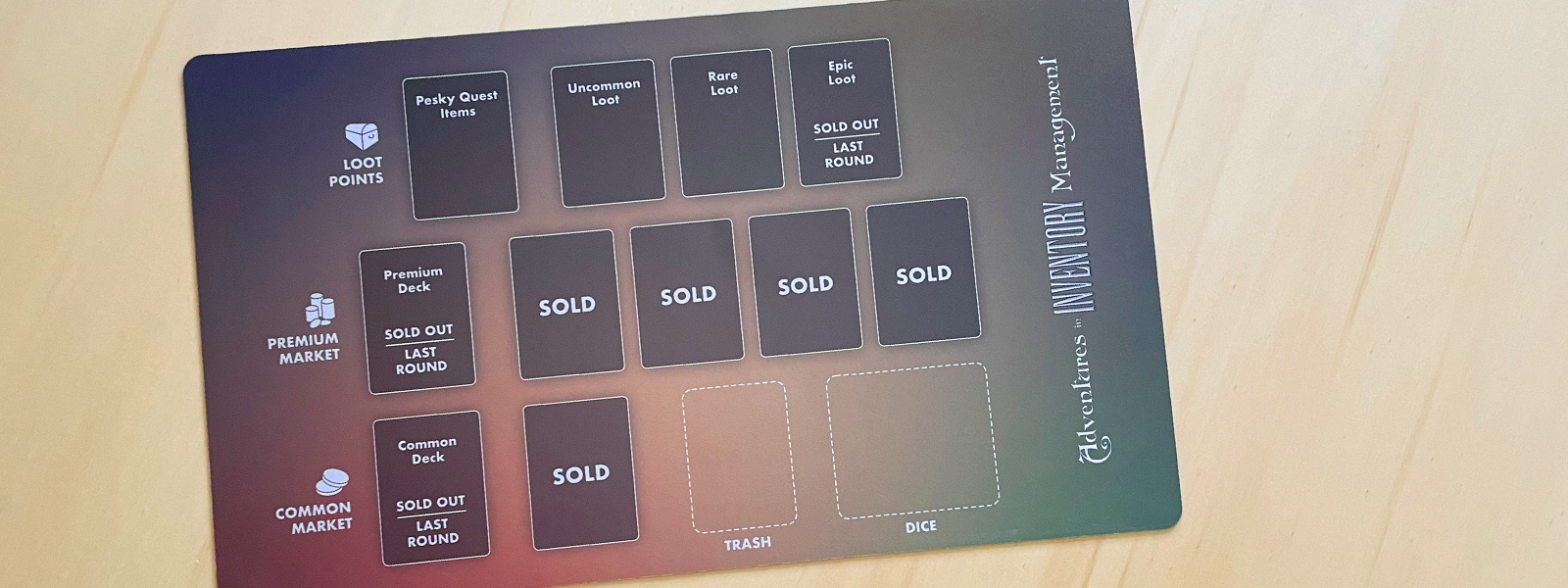 A neoprene mat for organizing the Market and Loot Point decks for Adventures in Inventory Management. This is completely optional, but if you want a fancier experience and a template for setting up the market areas this will do it!