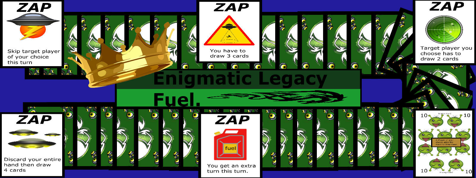 The object of the game is to get rid of your hand. If you play a higher card over the previous card than the previous player must draw a card. Zaps can be played to block other zaps. Trump cards can be played to make a player of your choice pick up the entire stack. Zaps allow for a very dynamic and challenging gameplay.