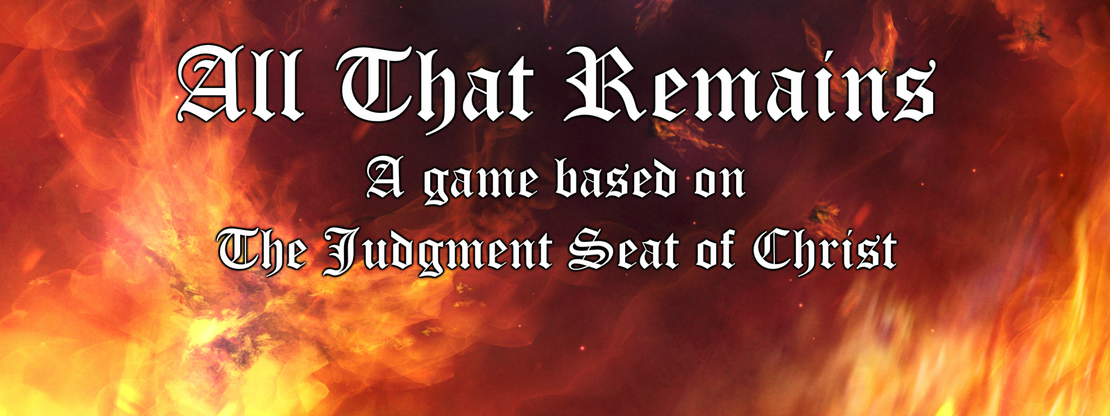 All That Remains is a 2-6 Player, Competitive Card Game, based on the Judgement Seat of Christ, where Players take the role of Saints being judged for their life’s work. Each Player receives a Life Card Deck, containing good works and bad works, which are then thrown into the fire throughout the game. The good works that survive grant rewards; each type of reward is worth a different amount of Points. The Player with the most Points at the end of the game wins.
