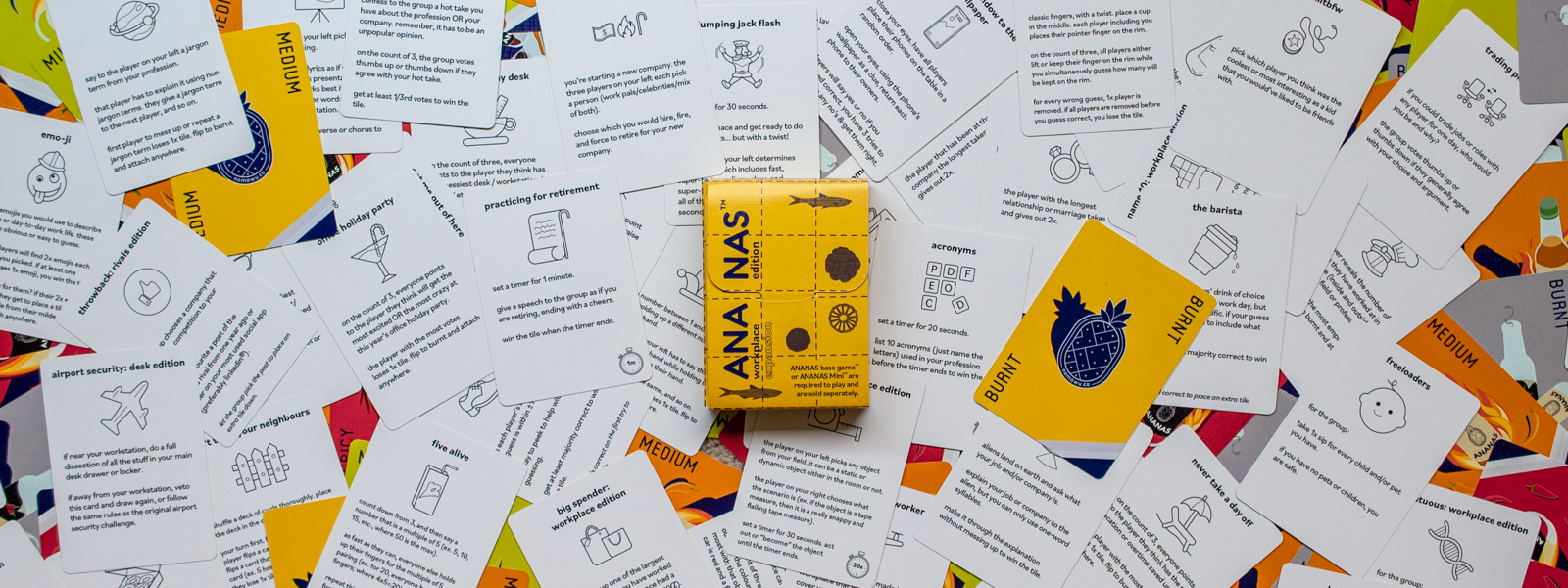 After a bunch of our coworkers asked about ANANAS and when they could play it, we realized the base game wasn't quite "suitable for work" vibes (fresh meat challenge, we're looking at you). Enter, the easiest decision we ever made... creating an expansion pack that is suitable for work. We hope you enjoy it!