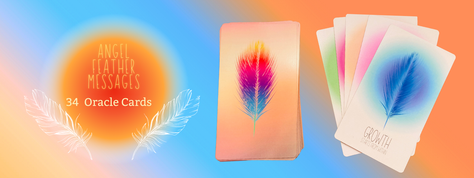 The Angel Feather Messages decks has 34 tarot-size fcards. It uses chakras colors, angel numbers, and feathers. It is Boho inspired and has a gentle energy and gives special messages to help you on your journey.