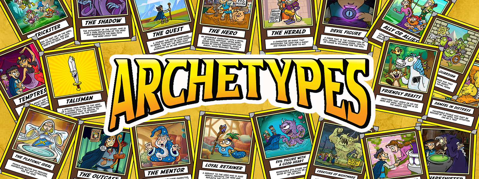 Included Archetypes: Archetypes include: the Hero, the Shadow, the Mentor, the Quest, the Threshold Guardian, the Herald, the Ally, the Talisman, the Trickster, the Shapeshifter, the Damsel in Distress, the Creature of Nightmare, Starcrossed Lovers, Friendly Beasts, the Loyal Retainer, the Devil Figure, the Evil Creature with a Good Heart, the Outcast, the Temptress, and the Platonic Ideal.