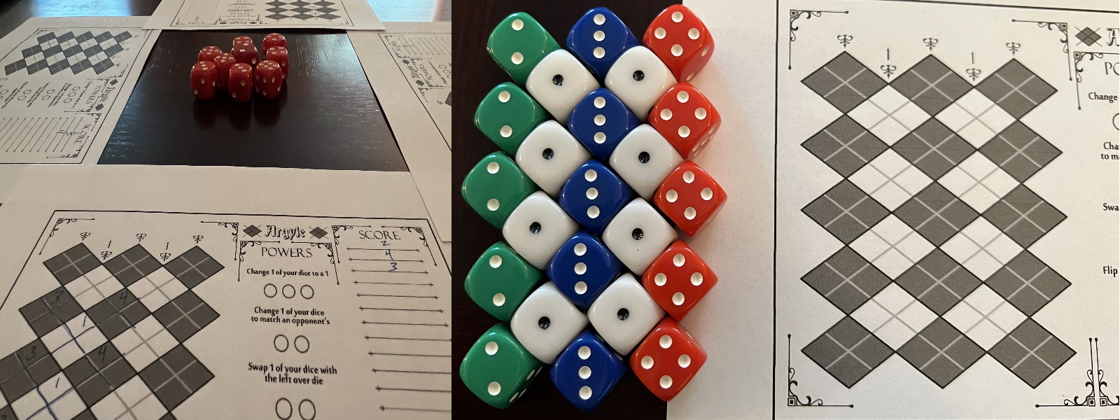 It plays solo or up to 100 players. Each round players will be seeking ways to maximize points on their sheet while forming their Argyle pattern, each die they place triggers a scoring option for similar values adjacent to it