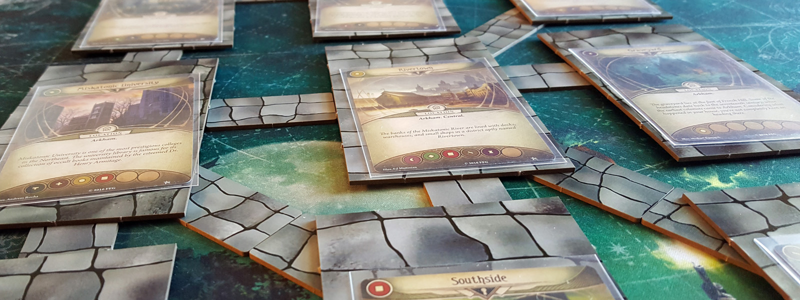 This set has a cobblestone street theme on one side, just right for city and civilized locations. On the reverse is a forest floor, ideal for any wilderness or woods places. This has no game-play effect, but it does look great! Both sides feature hand-painted, fine-art style artwork - not just some random stock photo. This enhances the gorgeous art and style of Arkham Horror's cards as you play. The effect on the location layout is transformative, and you will love the look and feel of the board as you succumb to the horrors of the mysterious unknown.