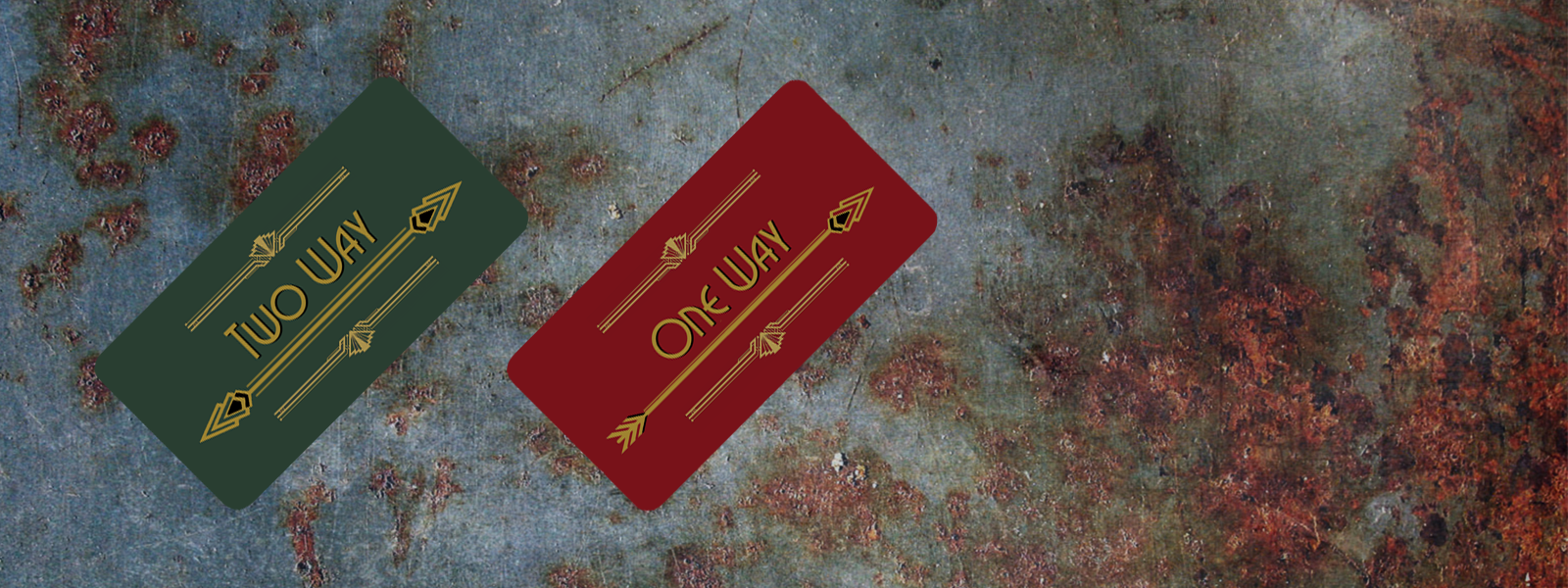 Simple art deco-style path markers make it easy to see which locations connect and which ones do not. Each marker is double-sided reading "one-way" (red background) on one face and "two-way" (green background) on the other.