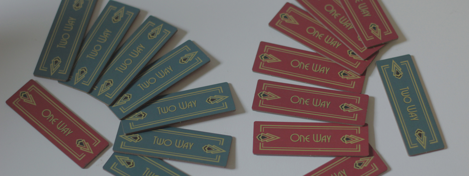 Simple art deco-style path markers make it easy to see which locations connect and which ones do not. Each marker is double-sided reading "one-way" (red background) on one face and "two-way" (green background) on the other.